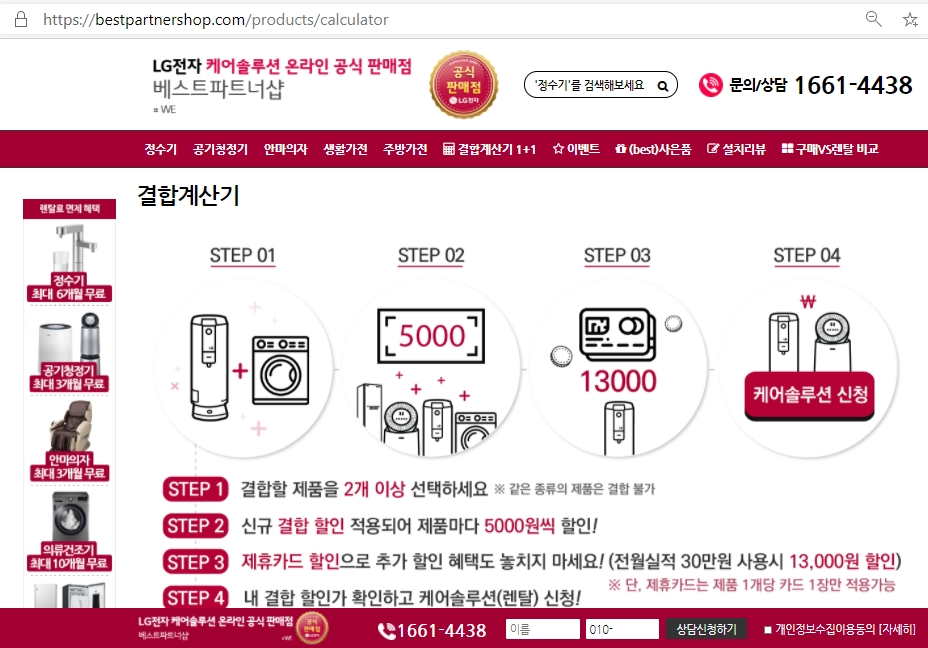 LG베스트파트너샵 결합계산기로 들어가 렌탈하고픈 LG가전제품만 클릭하시면 알아서 계산해드려요.