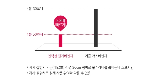 인덕션 3,000W 출력으로, 기존 가스레인지보다 2.3배 요리 시간이 단축됩니다